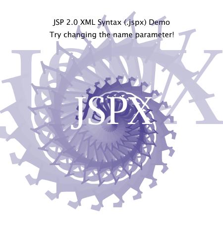 This example uses JSP 2.0's new, simplified JSPX syntax to render a Scalable Vector Graphics (SVG) document. When you view the source, notice the lack of a <jsp:root> element! The text to be rendered can be modified by changing the value of the name parameter.